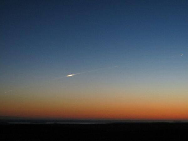 Bill Chater sai sattumalta kuvattua alaspäin palavina kappaleina putoa satelliitin iltahämärällä taivalla; kello oli 21:20 paikallista aikaa (2:20 Suomessa yöllä), kun hän oli ajamassa etelään ja huomasi "taivaalla savuvanan ja kirkkaan pisteen, joka hajosi kahteen osaan, ennen kuin hajosi uudelleen useampiin osiin kohti pohjoista lentäessään".