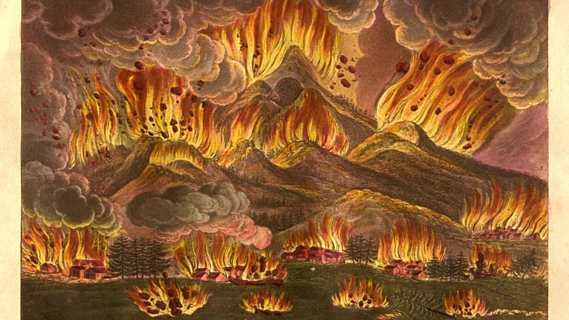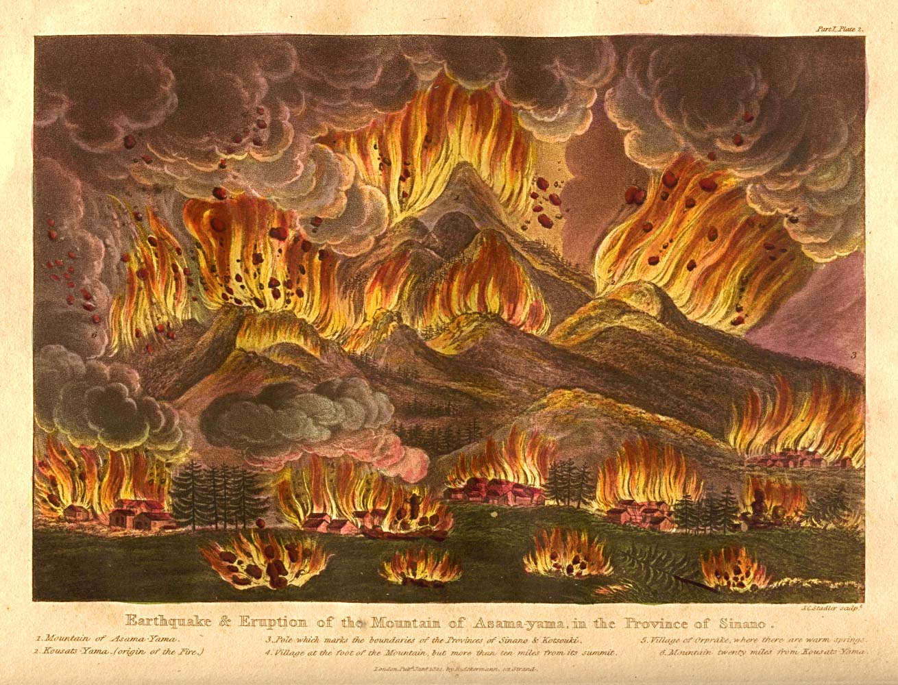 Honshūn saarella Japanissa sijaitseva 2 568 metrin korkuinen Asama-tulivuori on purkautunut viimeksi kuluneiden tuhannen vuoden aikana ainakin 120 kertaa. Viimeisin purkaus tapahtui vuonna 2009, jolloin tuhkaa satoi Tokiossa saakka, liki 150 kilometrin etäisyydellä. Joseph Constantine Stadlerin maalaus, joka julkaistiin Isaac Titsinghin kirjassa Illustrations of Japan (”Kuvia Japanista”) kuvaa vuonna 1783 tapahtunutta niin sanottua Tenmei-purkausta. Toukokuussa alkanut aktiivisuus jatkui kolmen kuukauden ajan ja suurin purkaus tapahtui elokuussa, jolloin 1 400 lähiseudun asukasta kuoli. Laavavirrat ja pyroklastiset pilvet sekä etenkin vuoren ympäristöön satanut tuhka aiheuttivat laajaa tuhoa. Suuri osa Shinanon ja Kōzuken provinssien pelloista muuttui useiden vuosien ajaksi viljelykelvottomaksi, mistä oli seurauksena noin 20 000 ihmisen hengen vaatinut nälänhätä.