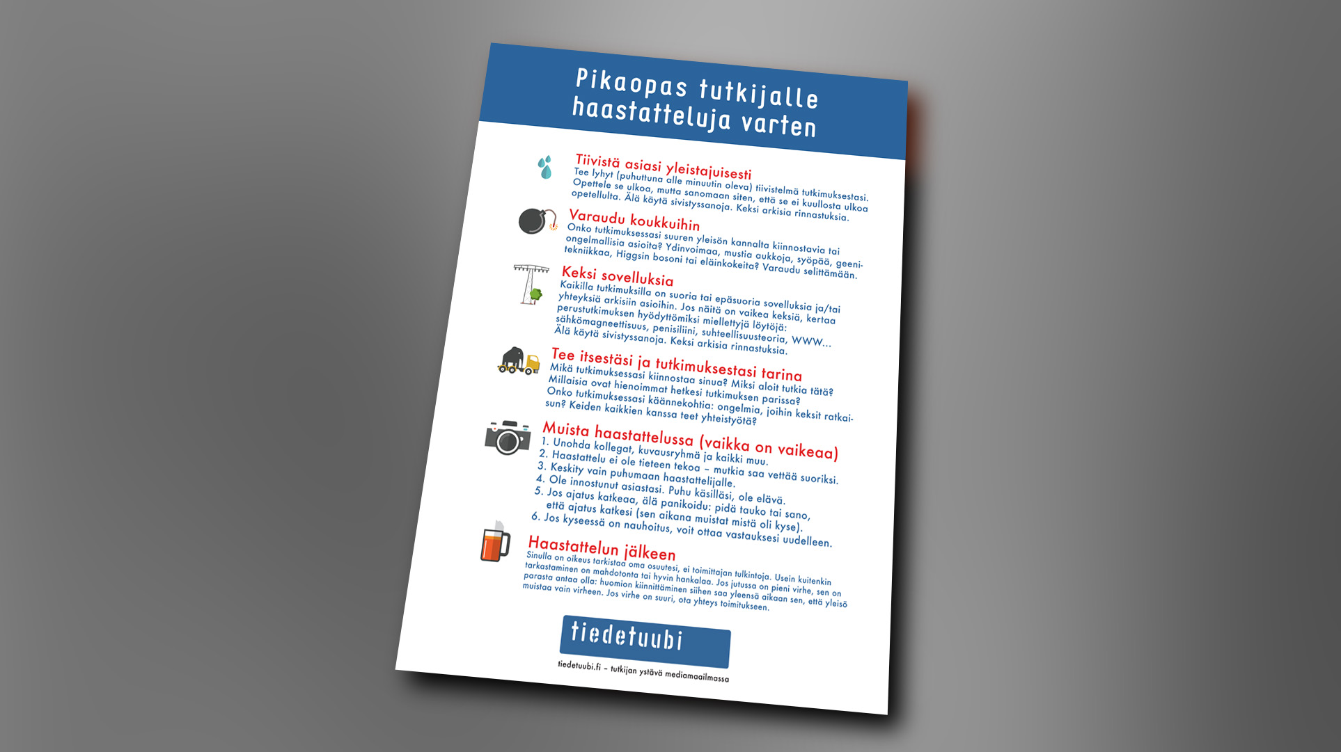 Tässä helposti tulostettava ja vaikkapa seinälle muistin tueksi kiinnitettävä lista vapaasti levitettäväksi: pikaopas_haastatteluun_tutkijalle.pdf