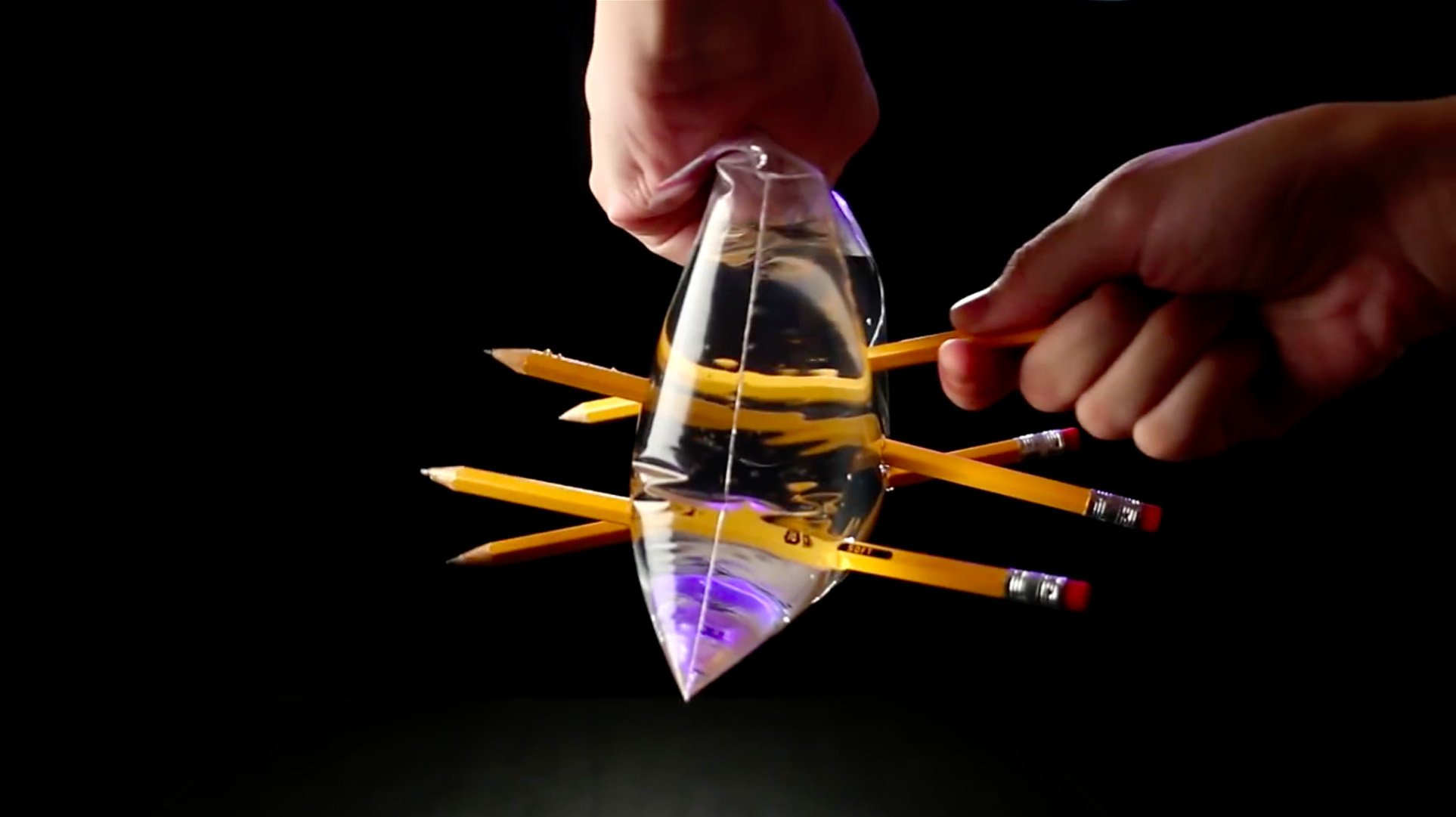 Temppuun tarvitaan vain muutama hyvin terävä lyijykynä (tai muu vastaava terävä, pinnaltaan tasainen puikkomainen esine), hyvä muovipussi (kuten iso uudelleensuljettava pussi tai muu vastaava) ja vettä.