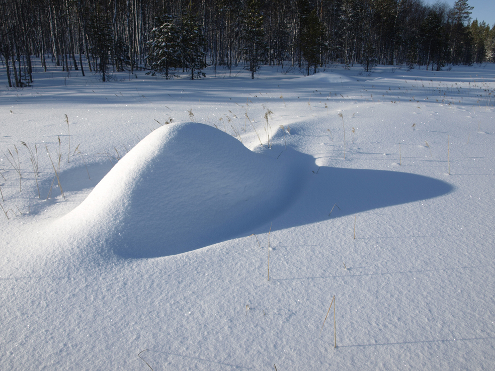 Jos aurinko kuitenkin sattuu paistamaan matalalta talviselta taivaalta, valo lankeaa maanpintaan hyvin viistossa kulmassa. Silloin lumi ei hohda yhtä kirkkaasti kuin keskellä aurinkoista kevättalven päivää. Matalalla olevan auringon valon väri on lisäksi hieman punertunutta, mikä entisestään lisää valon ja varjon kontrastia. Kun silloin tarkastelee hangen pinnalle heittyviä pitkiä varjoja, ne ovat voimakkaan sinisiä, lähes yhtä sinisiä kuin yllä kaartuva sininen taivas.